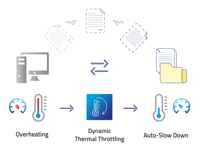 On the firmware front, Cervoz offers a feature known as Dynamic Thermal Throttling for its Flash products. This mechanism prevents the module from overheating due to large volumes of data write-in in a short period of time. In cases when themodule heats up to a temperature cap, the function automatically slows down performance and thus drops temperature before the module overheats.
